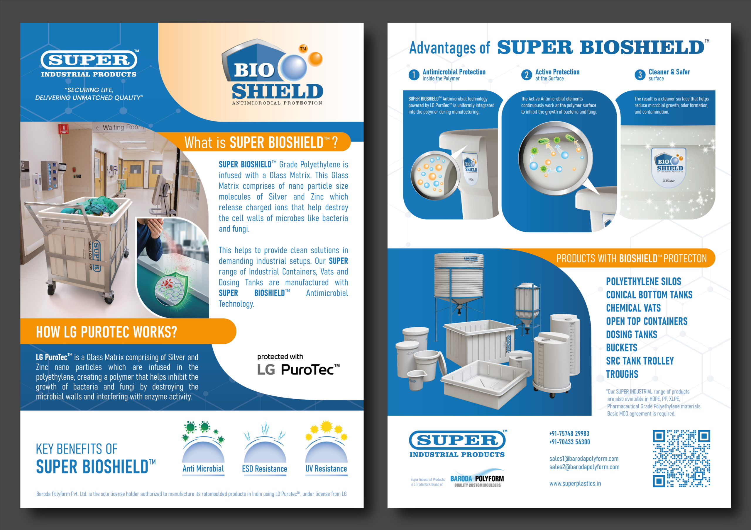 This helps to provide clean solutions in demanding industrial setups. Our SUPER range of Industrial Containers, Vats and Dosing Tanks are manufactured with SUPER BIOSHIELD™ Antimicrobial Technology.